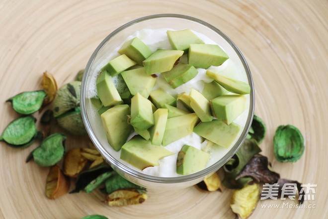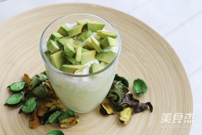 5.先倒入牛油果汁,舀3勺淡奶油放入杯中,最后用牛油果丁裝飾即可