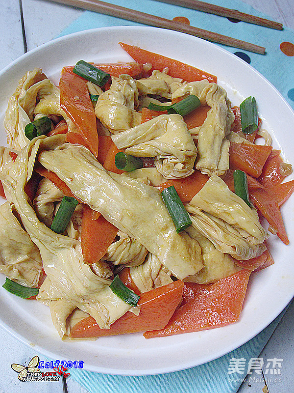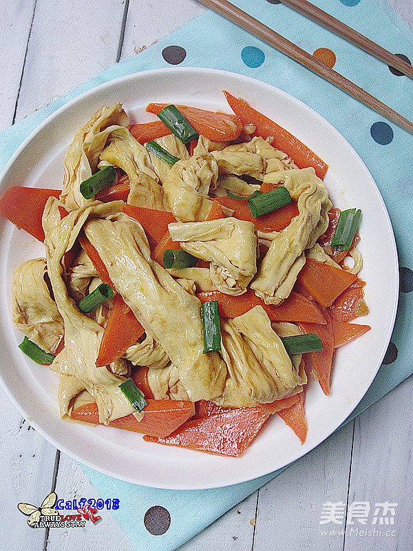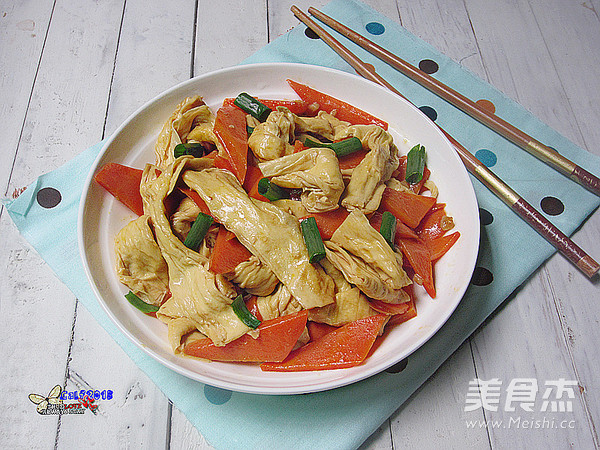 8.胡蘿卜炒至八九成熟時(shí),加入腐竹翻炒,加少許鹽調(diào)味