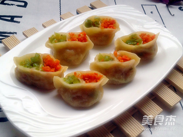 5.用油把胡蘿卜拌勻后加入適量的鹽拌勻,取出一點(diǎn)準(zhǔn)備放在上面用。 辣椒也用油拌勻后加入適量的鹽拌勻,同樣取出一點(diǎn)準(zhǔn)備放上面用。 雞蛋切碎,加入切碎的蔥花、蠔油和胡蘿卜、辣椒一起攪拌均勻,餡料制作完畢
