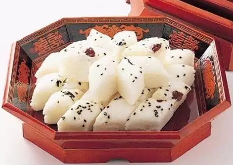 杭州人冬至喜吃年糕。每逢冬至做三餐不同風(fēng)味的年糕,早上吃的是芝麻粉拌白糖的年糕,中午是油墩兒菜、冬筍、肉絲炒年糕,晚餐是肉絲、筍絲湯年糕。冬至吃年糕,年年長高,圖個(gè)吉利。