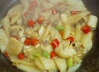 10.湯汁收到一半時(shí)放紅椒繼續(xù)煮。