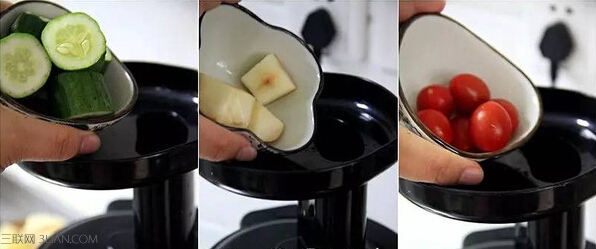 2、因?yàn)槭腔旌?u data-Ps2z="Lc4OuO">果汁,啟動(dòng)原汁機(jī)后,三種果蔬可以混著放進(jìn)去。