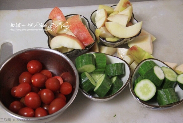 1、將圣女果,黃瓜,桃子都洗干凈,然后圣女果去蒂,黃瓜切段,桃子去核兒。