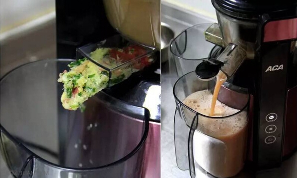 4、看一下最后的渣和汁,出汁率很高。原汁機(jī)的清洗也很方便,零部件拆開后一沖洗就好了,比傳統(tǒng)榨汁機(jī)方便很多。