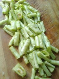 4.將豆角,摘洗干凈,置淡鹽水中浸泡十分鐘,撈起,瀝水;豆角切段