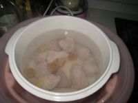5.把瑤柱,姜片,瘦肉入燉盅;