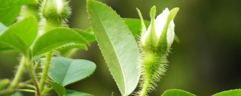 金櫻子高可達(dá)五米,它的小枝粗壯,散生扁彎皮刺,小葉革質(zhì),葉片形狀為橢圓狀卵形、倒卵形或披針狀卵形,邊緣有銳鋸齒,葉子顏色為亮綠色,它的花朵單生于葉腋間,花朵顏色為白色,果實(shí)形狀為倒梨形。