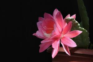蟹爪仙人掌株高為30-50厘米,分枝較多,莖節(jié)扁平、形如鉗形尖銳鋸齒,如同蟹爪一樣。蟹爪仙人掌在每年的元旦開花,有紅色、橙黃、白色、粉紅。喜歡生長在溫暖、潮濕和半蔭的環(huán)境下。