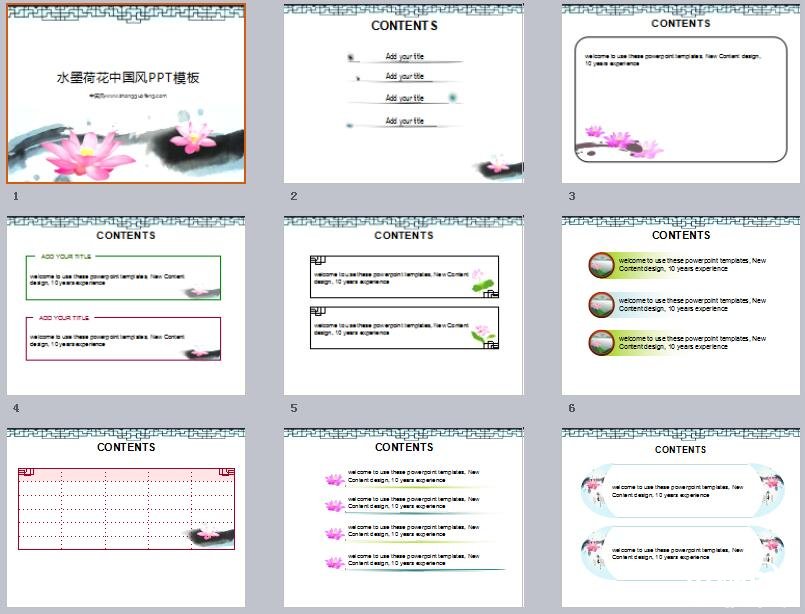荷花全身皆寶,藕和蓮子能食用,蓮子、根莖、藕節(jié)、荷葉、花及種子的胚芽等都可入藥。其出污泥而不染之品格恒為世人稱頌。“接天蓮葉無(wú)窮碧,映日荷花別樣紅”就是對(duì)荷花之美的真實(shí)寫(xiě)照。荷花“中通外直,不蔓不枝,出淤泥而不染,濯清漣而不妖”的高尚品格,歷來(lái)為古往今來(lái)詩(shī)人墨客歌詠繪畫(huà)的題材之一。家佳樂(lè)文學(xué)小編為您帶來(lái)水墨荷花家佳樂(lè)文學(xué)PPT模板,適用于文化匯報(bào)、教育匯報(bào)、專業(yè)匯報(bào)等。