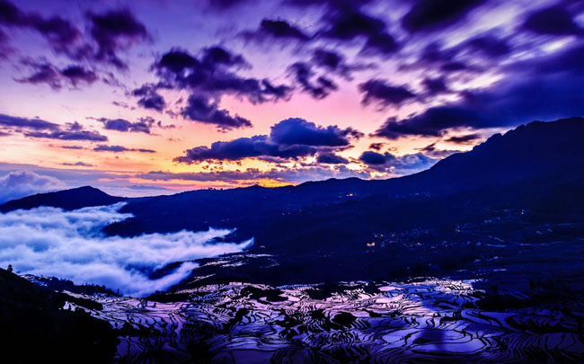 元陽(yáng)梯田包括多依樹(shù)、愛(ài)春、大瓦遮等連片近萬(wàn)畝梯田。這里三面臨山,一面墜入山谷,猶如一個(gè)大海灣。梯田上部比較平緩,下部則地勢(shì)陡峭,從上俯瞰,猶如巨瀑傾瀉,無(wú)比壯觀?!?/p>