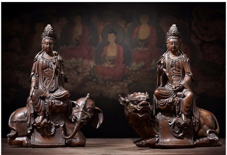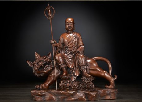 地藏王菩薩一手捧珠,一手拿錫杖,性格刻畫栩栩如生,色澤富貴古雅。火焰紋背光是帶有濃厚藝術色彩的裝飾紋樣,蘊含了吉祥昌盛的美好寓意,是我國佛像藝術形式中不可缺少的組……