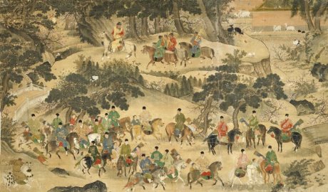此圖繪的是明宣宗朱瞻基率眾文臣和宦官在近郊狩獵的壯觀場(chǎng)景。騎馬在最高處的即朱瞻基,其形略大于眾臣,表明這個(gè)時(shí)期的宮廷畫家已注意到通過(guò)構(gòu)圖來(lái)突出皇帝像,而非片面地強(qiáng)……