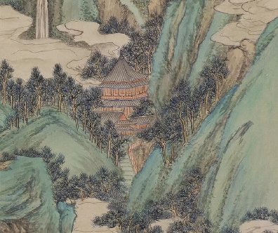 此畫圖繪了白云吞吐漂浮于山間,山谷中松林茂密,清溪流淌,隱露樓觀,境界清幽,表現(xiàn)了一派世外桃源般的仙境,畫幅右上楷書洞天山堂四字,點(diǎn)明了全畫的主題。詩(shī)堂有王鐸跋語(yǔ)……