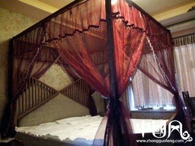 中式木床復(fù)古床幔蚊系帶式簾頭中式蚊帳四柱床裝飾紗?!?/p>