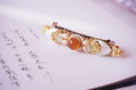 貝產(chǎn)珍珠,珍珠飾貝,如此,便有了這精美雅致的杰作,請(qǐng)欣賞家佳樂文學(xué)小編為你帶來的白蝶貝殼雕花珍珠發(fā)夾。……